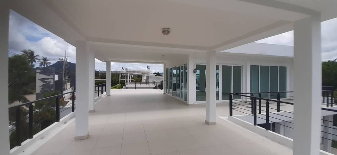 5 спален, 5 санузлов, гостиная, кухня, гараж, сад, бассейн и на втором этаже - терраса.